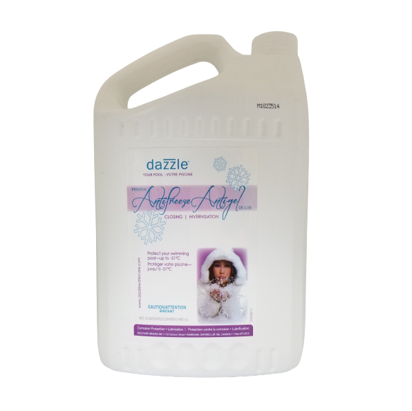 Dazzle's Premium Anti-Freeze Antigel is the must-have product when closing either a spa or a pool. It is eco friendly and will protect your pool or spa pipes and equipment up to -51°C.