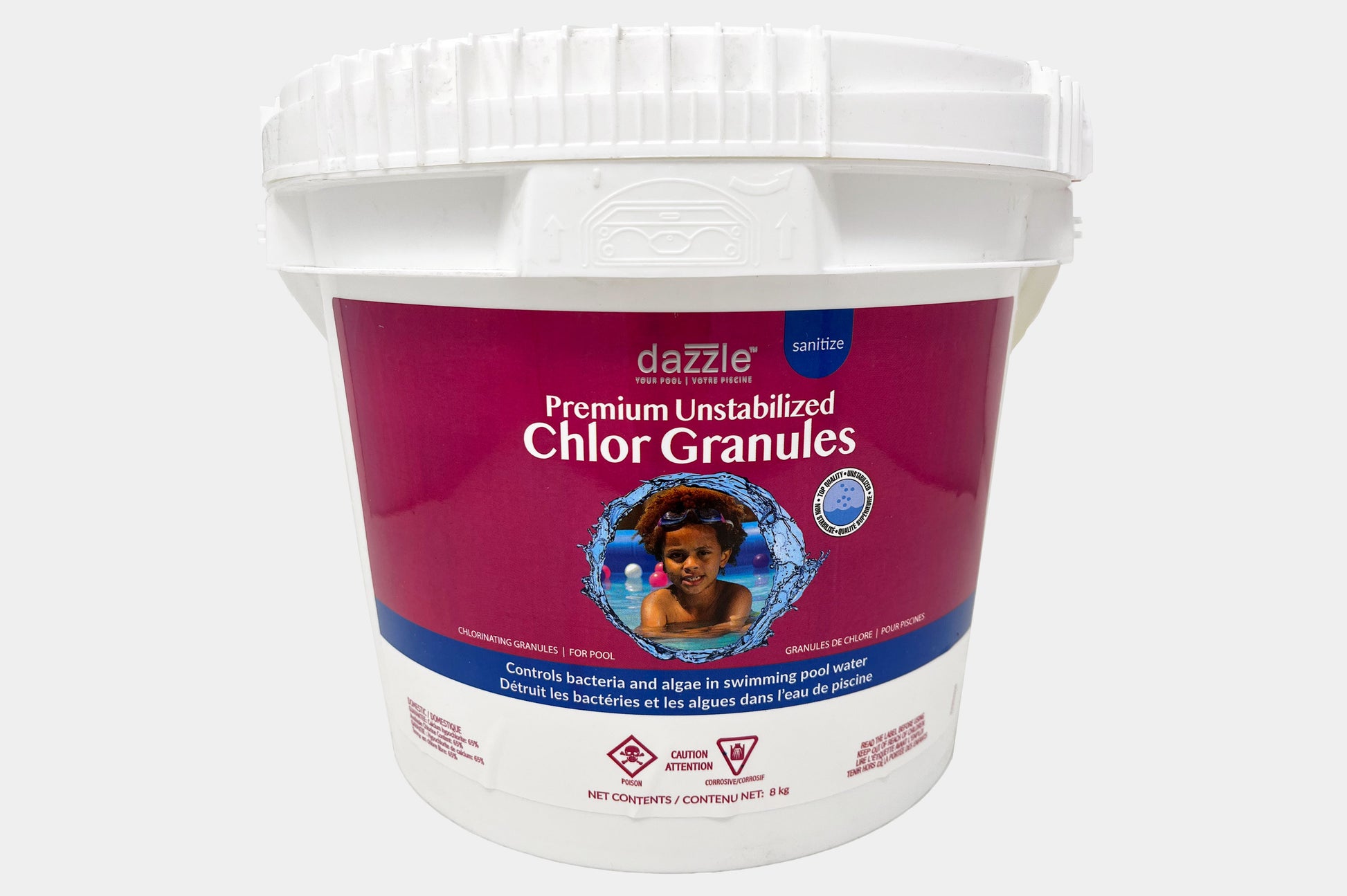 A premium, quick dissolving, unstabilized granular chlorine for daily, hand-feed application to control algae and bacteria in swimming pool water. Contains 65% Calcium Hypochlorite. Can also be used for periodic shock or super chlorination treatments.