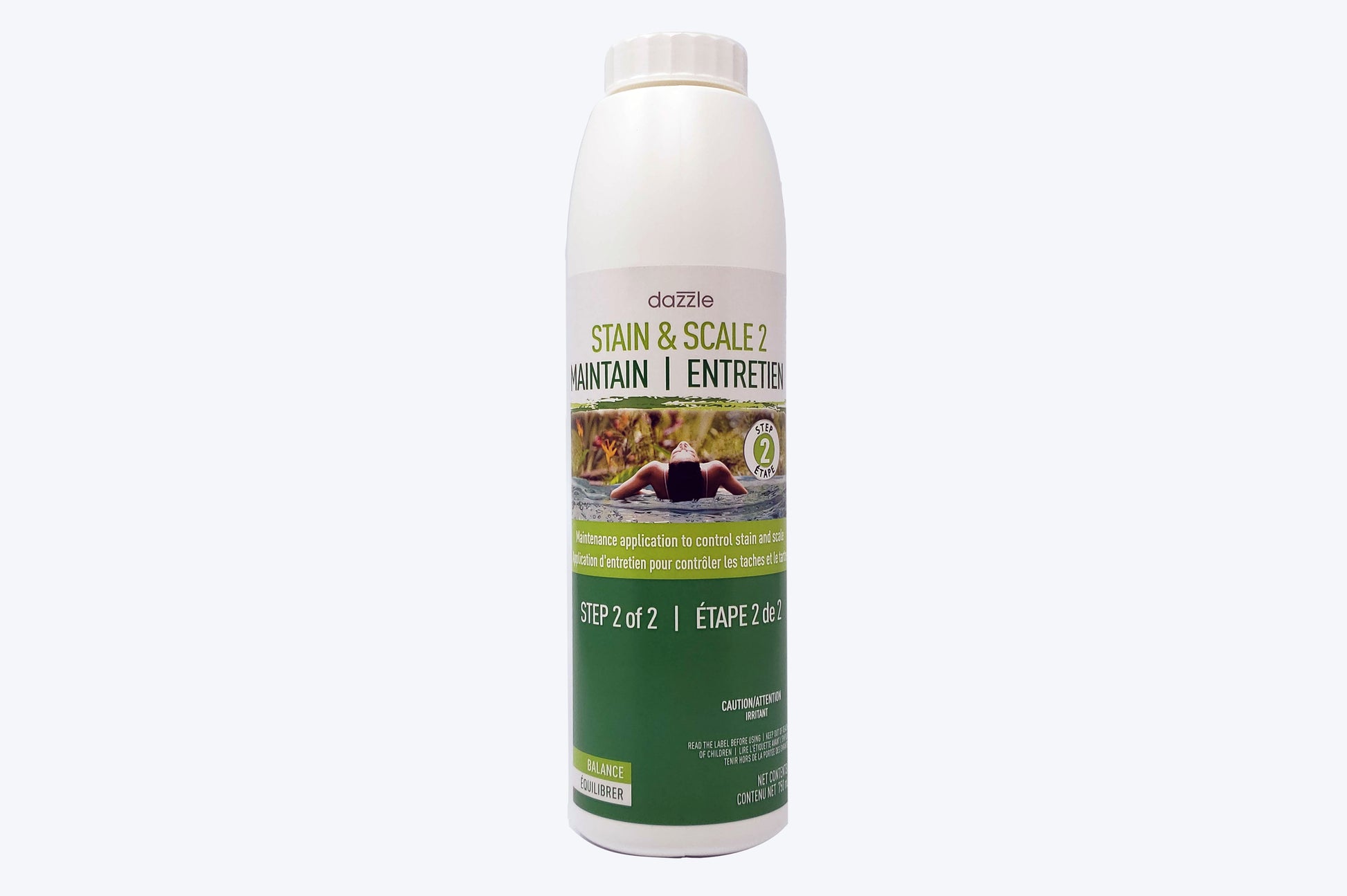 Dazzle Stain and Scale 2 is part of a two-part system for preventing staining and scaling in your hot tub. Its unique formulation is designed to work with Dazzle Stain and Scale 1 to provide the ultimate protection against staining and scale formation. Unlike most ordinary stain and scale products. Dazzle Stain and Scale 2 is biodegradable, 100% phosphate-free and will not break in high chlorine and bromine conditions.